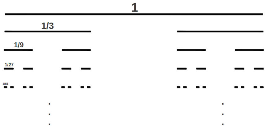 More on this in a minute. One way we might try convince ourselves that there is indeed not much else in $C$ beside “endpoints” is to think about how much of the interval $[0,1]$ is left once we’ve made all of our cuts. To do this, we just need to think about how much we delete on each pass. On the first pass, we delete one interval of length $1/3$ ($1/3^1$). On the second, we delete 2 intervals of size $1/9$ ($1/3^2$). On the third, we delete, 4 intervals of size $1/27$ ($1/ 3^3$). Generalizing this pattern, we see that on the $i$th iteration, we cut $2^{i-1}$ intervals, each of size $1/3^i$. To count up how much length we cut, we just need the sum of