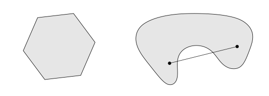 In the left set (all the points on the inside of the hexagon), pick any two points you want. Now draw a line segment between them. Notice that no matter what pair of points you pick, all points along the line segment between them will lie inside the hexagon! In the right set, on the other hand, we see pair of points (there are actually many, can you find another pair?) for which the line segment between them is not fully contained within the set. The set on the right is thus not convex.
